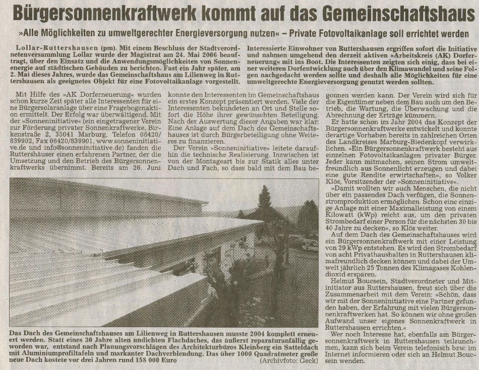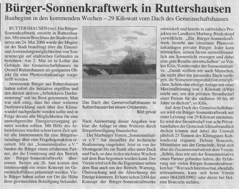 Auf dem Gemeinschaftshaus Ruttershausen wurde 2007 eine Bürgersolaranlage errichtet. Untersuchungen ergaben, dass auf der Dachfläche eine Photovoltaikanlage wirtschaftlich betrieben werden kann. Da vorrangig den Ruttershäuser Bürgern die Möglichkeit zum Erwerb von Anteilen eingeräumt werden sollte, wurde das Interesse der Ruttershäuser durch eine Fragebogenaktion an alle Haushalte ermittelt. Diese im Mai 2007 durchgeführte Aktion zeigt eine hohe Resonanz der Bürger bezüglich einer Beteiligung (45 Interessenten). Die Sonneninitiative Marburg e.V. hat ein Konzept für die Bürgersolaranlage erstellt.