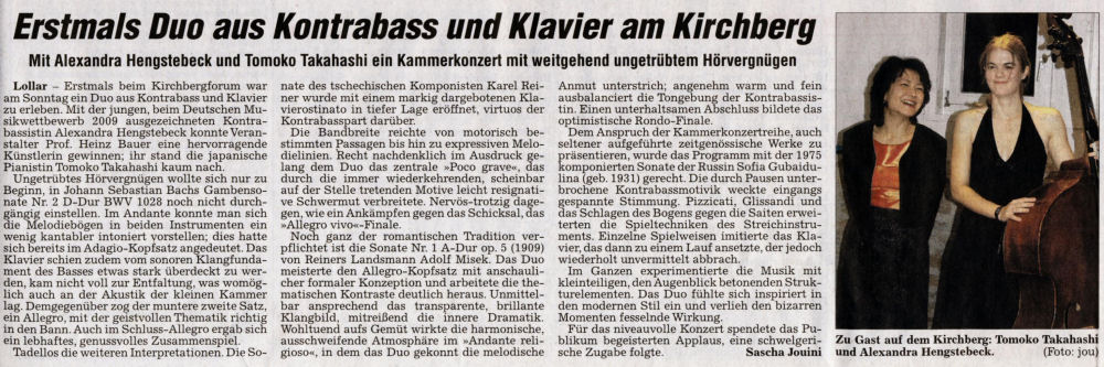 Mit Alexandra Hengstebeck und Tomoko Takahashi ein Kammerkonzert mit weitgehend ungetrübtem Hörvergnügen. Lollar, Erstmals beim Kirchbergforum war am Sonntag ein Duo aus Kontrabass und Klavier zu erleben..........